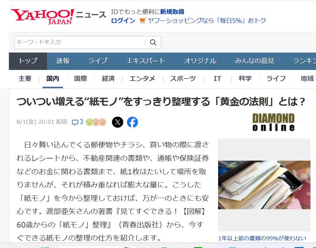 おかげさまでYahooニュースに「ついつい増える“紙モノ”をすっきり整理する「黄金の法則」とは?」が掲載されました。