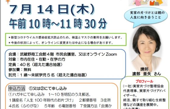 • 2022年1月14日(金)埼玉県内 自宅と実家の片づけ講座~ステイホームを快適に~(予定)